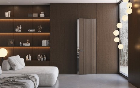 Модель двери с глухим полотном в алюминиевой кромке или без кромки с вертикальной фрезеровкой. Особенно эффектна в интерьерах современного стиля.